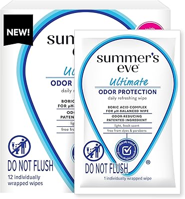 Summers Eve Ultimate Odor Protection Daily Feminine Wipes, Gentle pH-Balanced Formula with Boric Acid Cleanses & Removes Vaginal Odor, Individually Wrapped Body Wipes, 12 Count